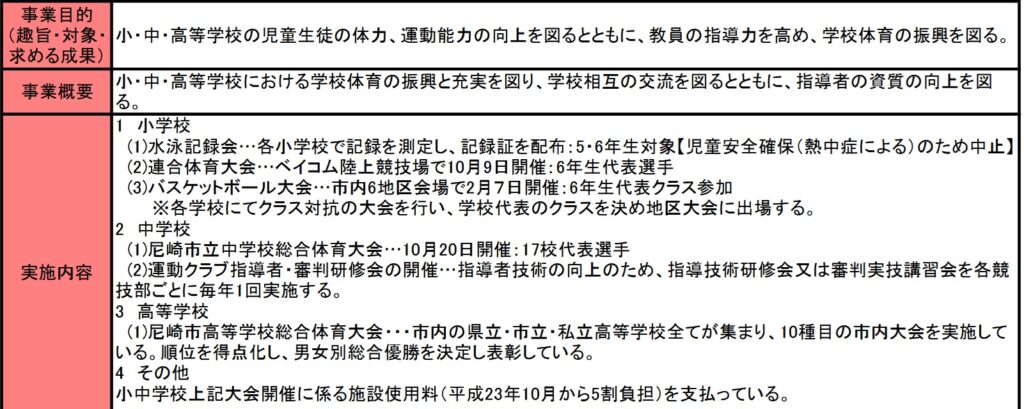 今回は教育関係事業の中の、体育に関係した事業です。昭和29年度から実施されている学校体育関連事業費です。この事業費は尼崎市内の公立学校(小・中・高)が合同で行う、体育大会の事業費になっています。内容からは、その実施目的を達成する為には効果がなく、ただ慣例に従って毎年行われている儀式のような事業であることがわかります。