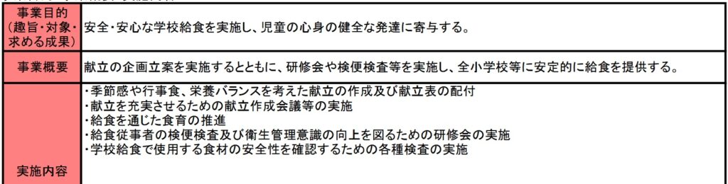 事業の目的には『中略~健全な発達に寄与する』と書かれており、実施内容を見ても、献立作成・給食従事者への検便検査・衛生管理意識向上の研修会・食材検査の実施などがあります。