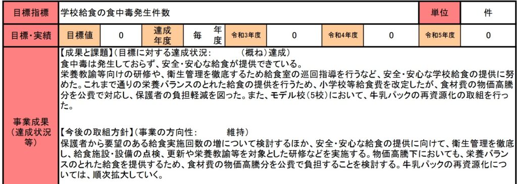 しかし、事業の目標指標では『給食の食中毒発生件数0』を目標値にしています。