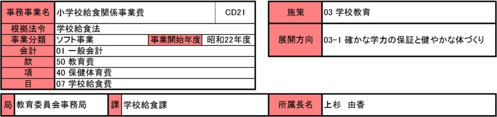 この事業は事業名からして、尼崎市内の公立小学校への給食配布に関する事業ですが、内容を見ていくとなぜか、個人的には福祉関係にすべき費用が含めれていました。またこの事業でもそうですが、目的に合致した目標指標とはなっておらず、またしても目的が曖昧な状態で、気づけば事業費が増える「余白」をうまく作っている印象を感じた事業です。