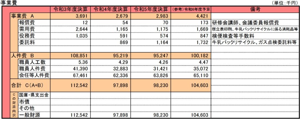 先ほど給食関係の事業なのに、牛乳パックの回収が含まれていると書きました。それは事業費の項目でも記載されており、回収委託料やリサイクルに係る消耗品という名目で、少なくともこの事業目的とは関係がない費用が、事業費に含まれています。