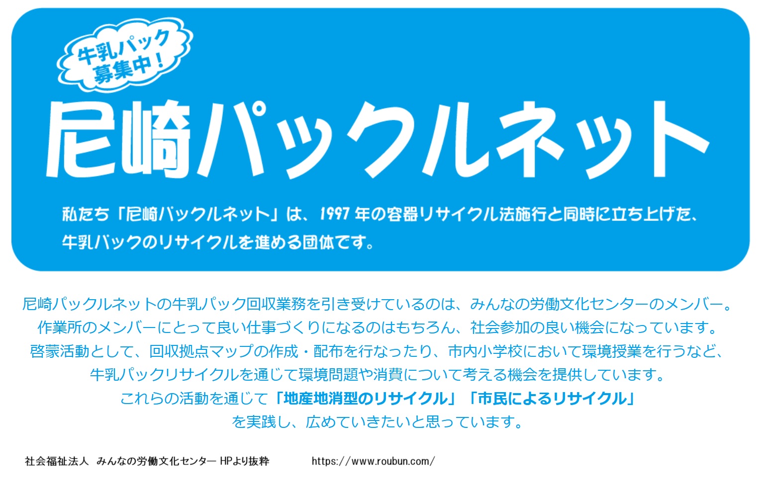 この牛乳パック回収についてですが、ネットで調べた情報では、社会福祉法人みんなの労働文化センターというところが、尼崎パックルネットというリサイクル団体を通じて、市内で牛乳パックの回収を行っているようです。