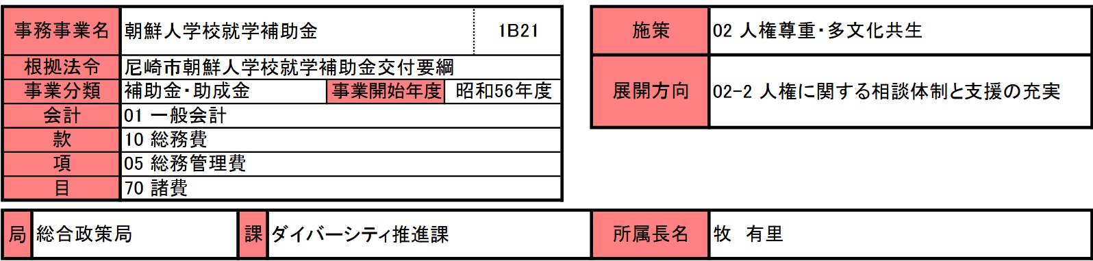 下記朝鮮人学校就学助成金の事業費。事務事業評価では、補助金の名目で記載されている。