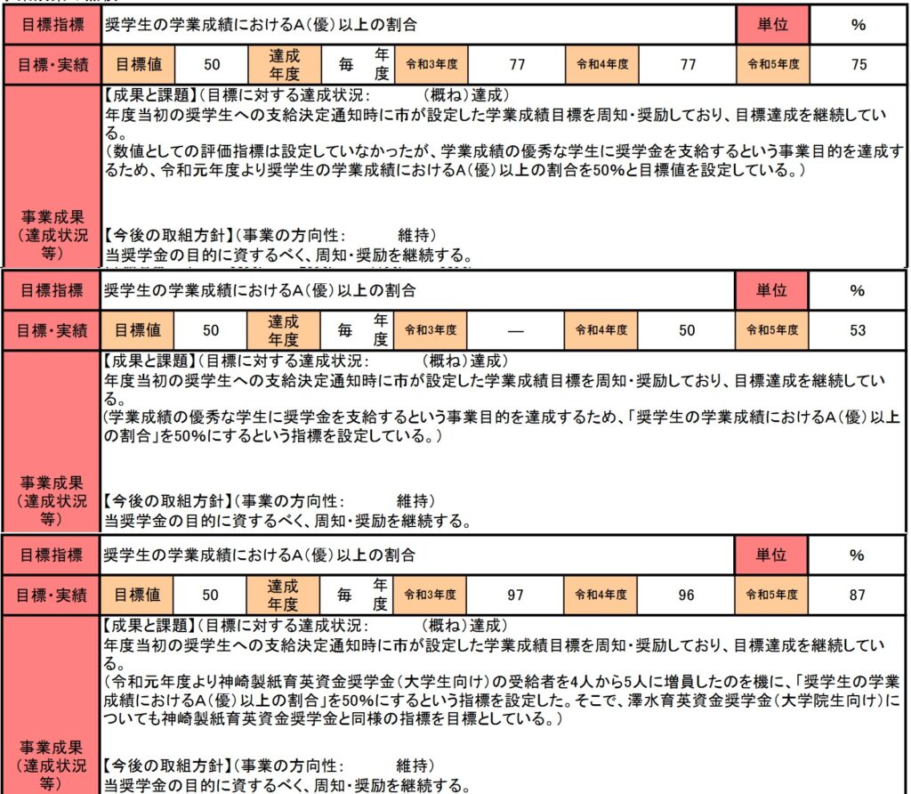 この奨学金制度ですが、事業としての目標指標はいずれも、「対象者の選考試験での成績を上げること」を目標にしています。