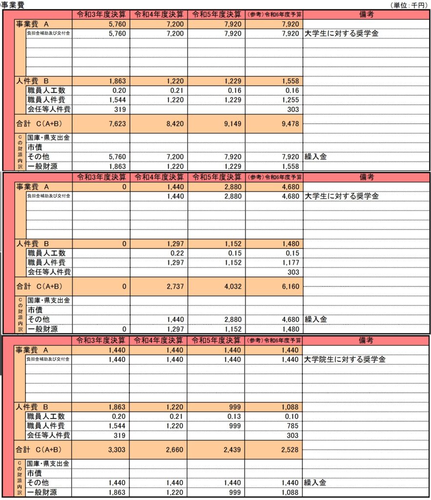 事務事業評価の内容 令和6年 施策03 【学校教育】尼崎市の奨学金事業3件