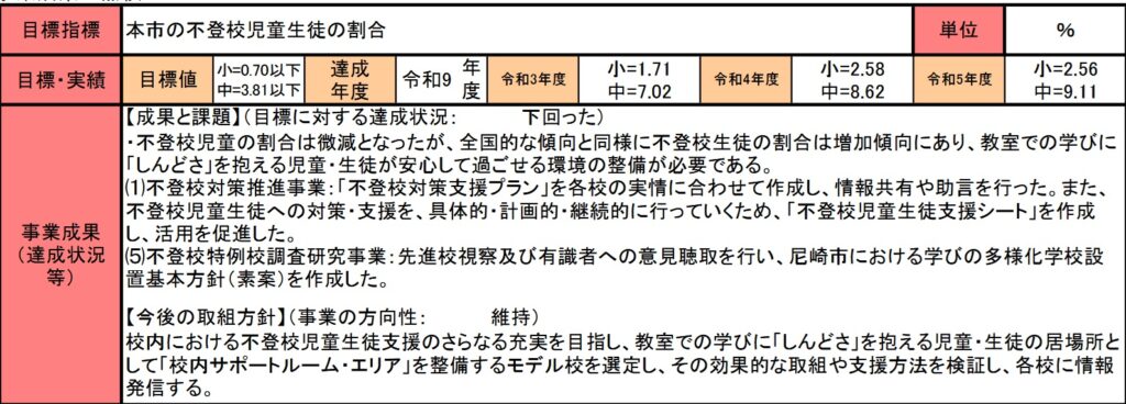 この事業の目標値は、不登校生のゼロではなく、割合を低くしていくとあります。今後はこの割合が少なくならないので、対策として、新たな事業費を作成(事業費を5つに分ける)したり、別の事業費に5つの事業を振り分ける、などの見栄えのする対策を実施したことにして、全体として事業費(税金)だけが増えて、不登校対策としては何も進まない。そんな未来が予想できる事業成果です。