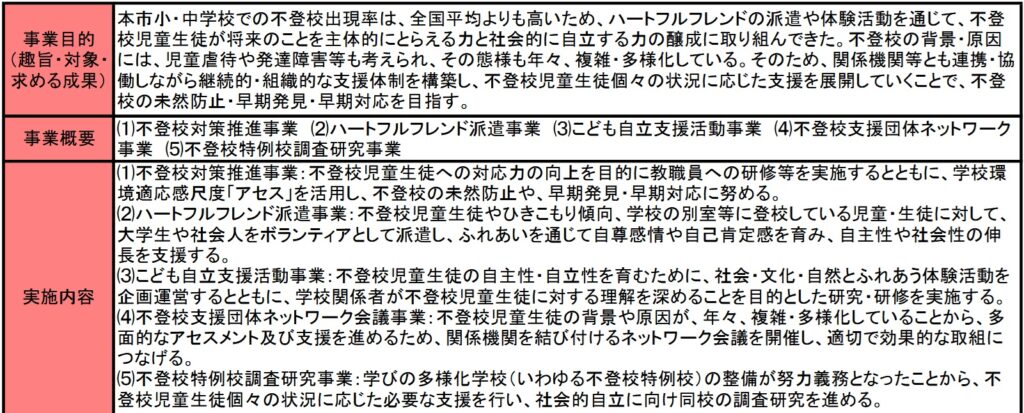 今回は学校の不登校生徒を対象にした事業、不登校対策事業費についてです。平成3年度から開始されており、事業内容からは、