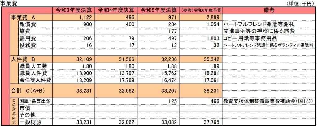 またこの事業費には、文部科学省がら、教育支援体制整備補助金という補助金が入っているとあります。しかしこの補助金ですが、文部科学省が公表している教育支援体制整備補助金の交付要綱には下記のように、交付の目的が記載されています。しかし今回の事業費ではその目的とは異なった内容に使用されており、この事務事業評価からは、交付金の目的外使用を行っているのではないかと疑念に思ってしまいました。