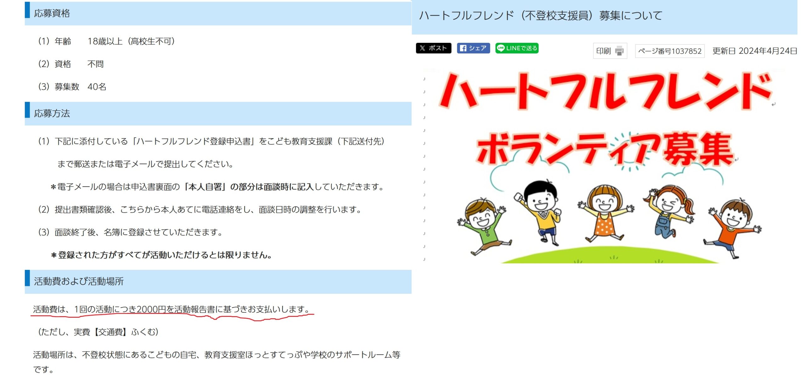 この事業にあった「ハートフルフレンド」についてですが、尼崎市の募集ページを見ると、ボランティアの文字が見えます。ハートフルフレンド(不登校支援員)について