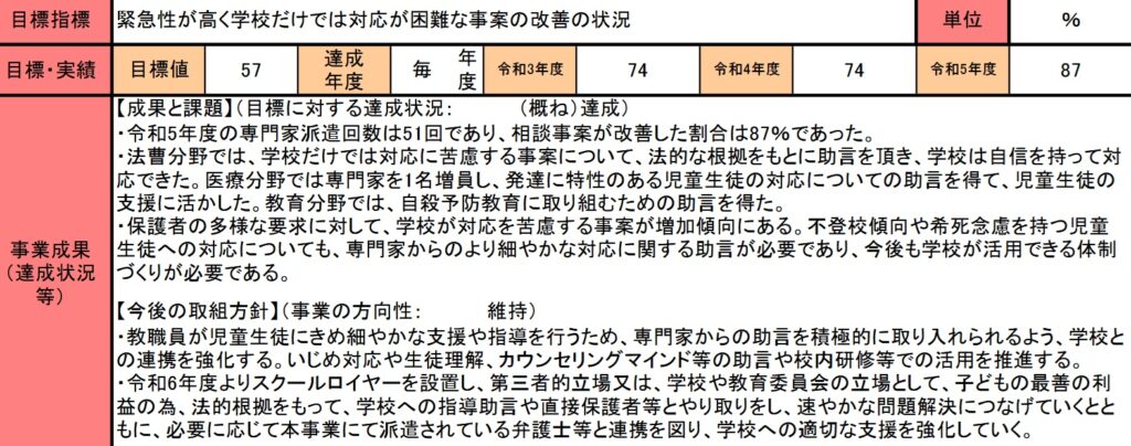 次にこの事業成果では、専門家派遣事案のうち、8割以上で改善したとあります。当然学校側から見ての「改善」であって、これらの事案で当事者となった子供やその親たちには、何も「改善」されていない可能性もあります。それらは当然ながらこの事業成果には記載されいませんが・・・