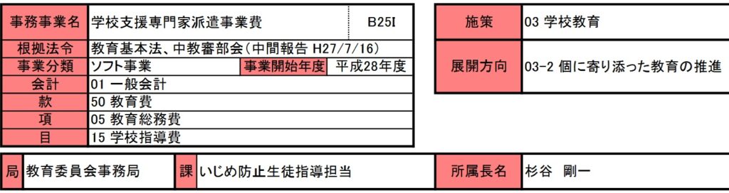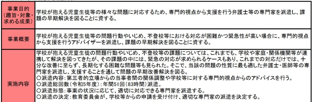 学校支援専門家派遣事業費は平成28年度から開始された事業で、学校に専門家(ここでは弁護士・医者)を派遣して、課題解決の手助けを行う事業とされています。